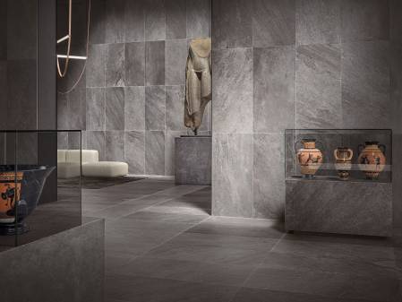 Style naturel, esprit recherché: des effets matériels souples qui interprètent roche, pierre, sable, se traduisant en surfaces fluides qui dépassent la frontière entre intérieur et extérieur. La collection combine de manière originale différentes textures, plus ou moins prononcées, pour obtenir un rythme à la fois mouvementé et équilibré.