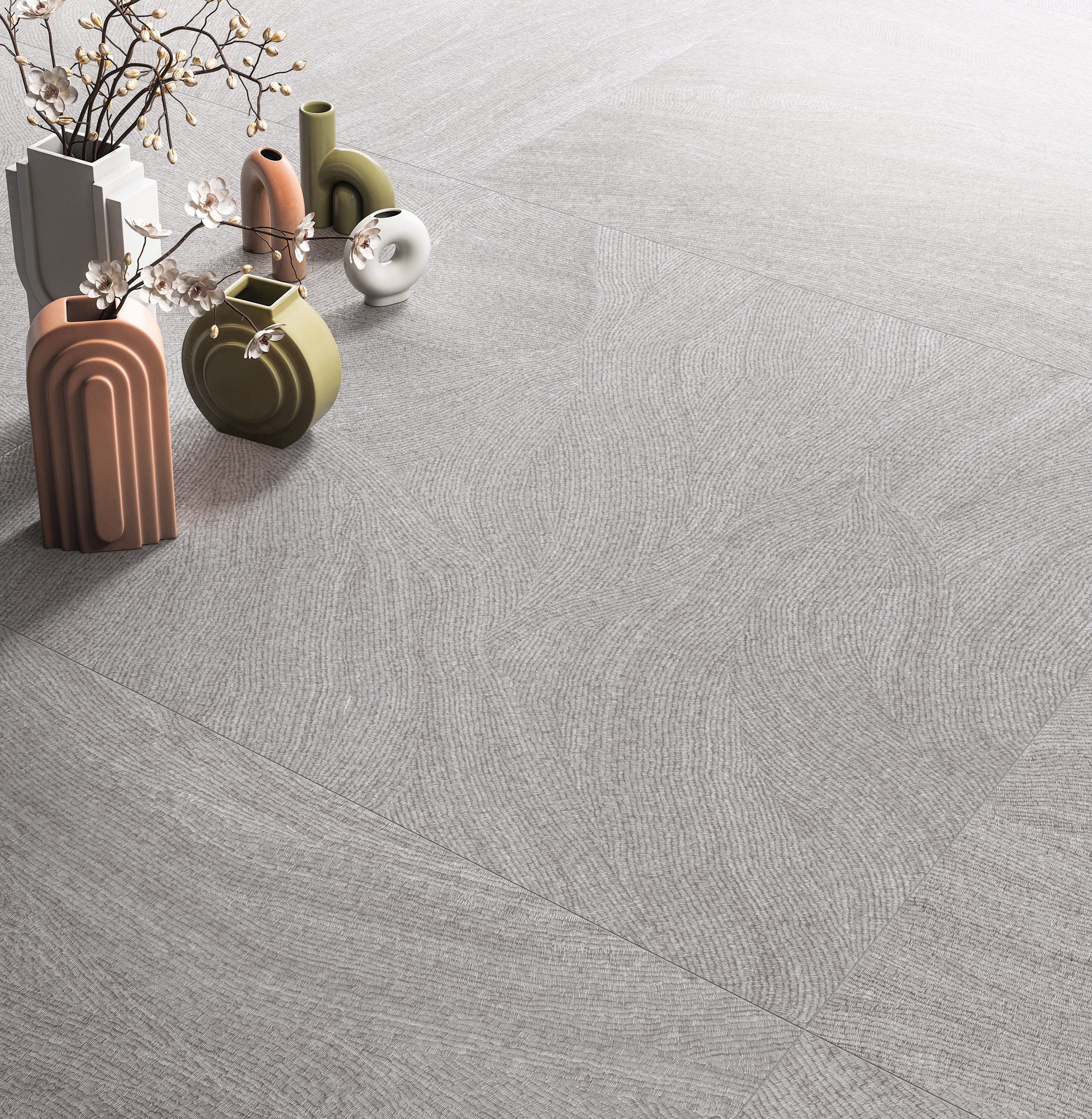 Disponible au format 80x80, la palette interprète la complexité du monde intérieur dans une clé chromatique, reflétant les multiples nuances de l'esprit et la profondeur des humeurs. Pure , un blanc confortable et serein ; Grace, un gris élégant ; Bold, un noir intense et audacieux ; Cozy, un beige accueillant ; Blush, une pêche intense et douce ; Earthy, un brun naturel ; Quiet, un vert relaxant ; Wavy, un bleu profond et méditatif. L'effet visuel varie également en fonction de la distance d’observation et des conditions d'éclairage changeantes, qui activent le lustre à la surface, soulignant les graphiques.